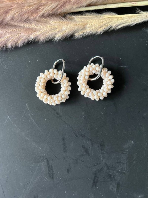 Nina in een mooie nudetint. Een zilveren creool met een prachtige hanger van facetkraaltjes.