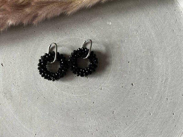 Nina in zwart. Een zilveren creool met een prachtige hanger van facetkraaltjes.