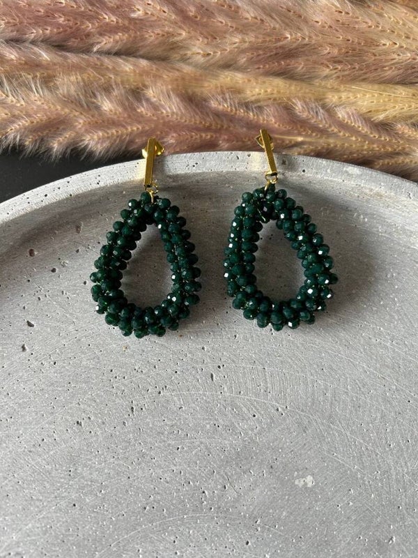 Lynn in het donkergroen. Een gouden stekertje met een prachtige hanger in een diepgroene kleur gemaakt van facetkraaltjes.