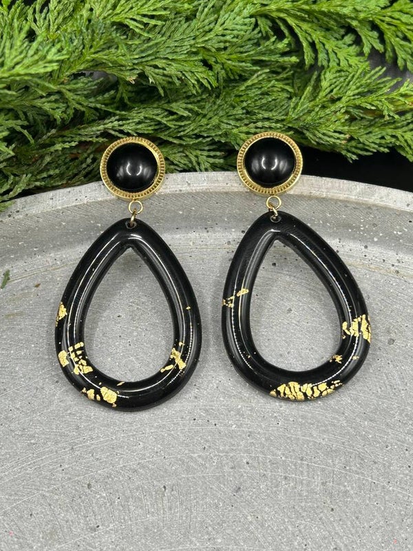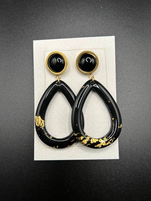 Faye in glanzend zwart met een klein beetje goudfolie. De gouden setting met zwarte cabochon als bovenkant maakt het helemaaal af.