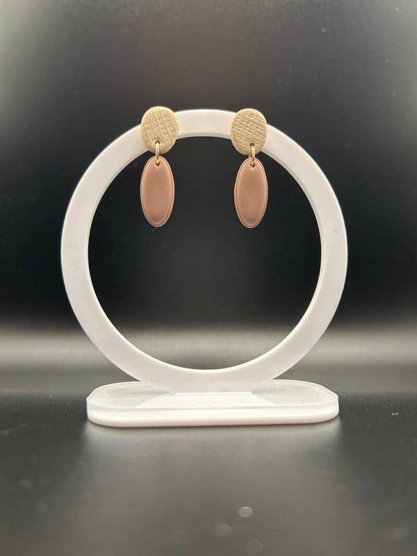 Sanne in een beigekleurig stekertje met structuur en een glansje met een nudekleurig verfijnd hangertje.