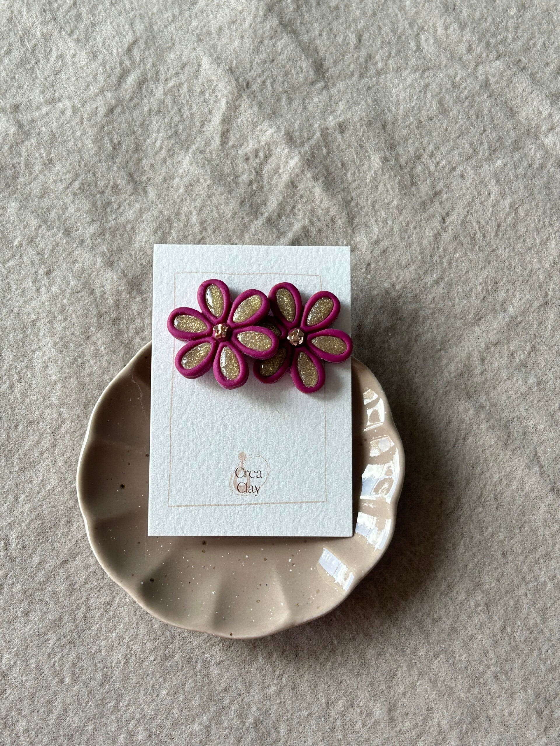 Een prachtige stud in de vorm van een bloem een mooie magentakleur en goudkleurige blaadjes.